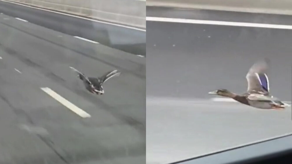 Eenden trage vliegers? Think again, deze gevleugelde jongen doet weinig onder voor de auto's om hem heen en gaat rustig een vaartje van zo'n 96 km/u.