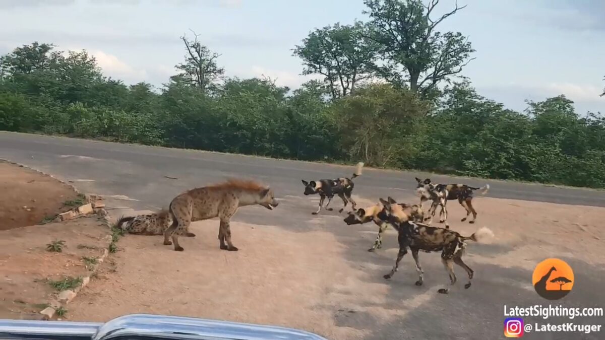 Een man was in het Kruger National Park in Zuid-Afrika een hyena met jong aan het filmen toen ineens een bende wilde honden problemen kwamen zoek. Tuig van de richel!