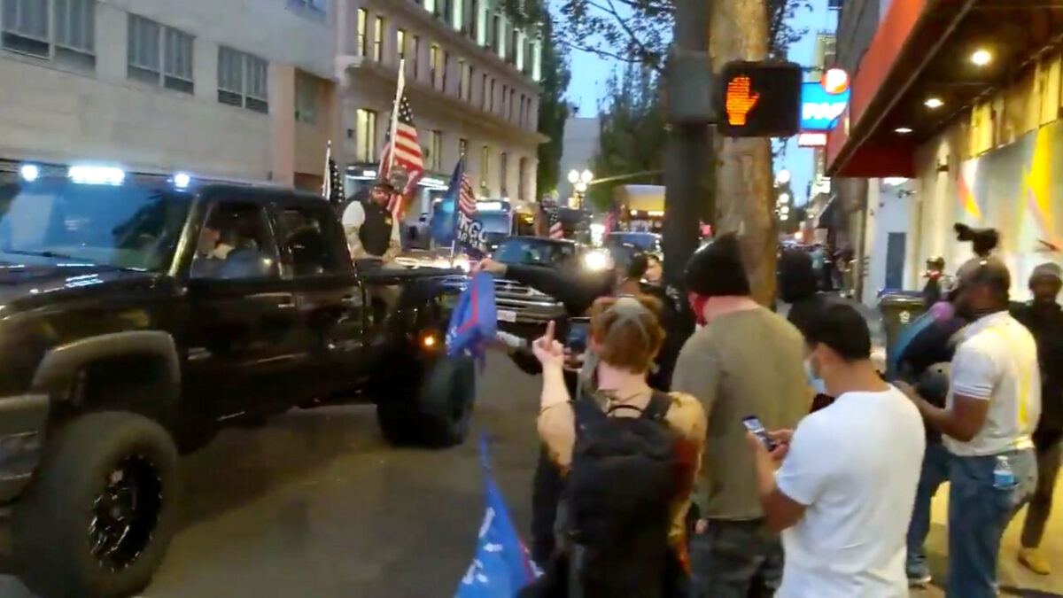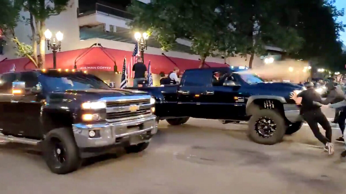 Nu Trump heeft aangegeven dat hij 'law & order' zal herstellen als de (uiteraard democratische) burgermeester hierom vraagt, maar een aantal aanhangers van Trump besloot hier niet op te wachten en zelf in hun pickuptruck te stappen om de orde te herstellen.