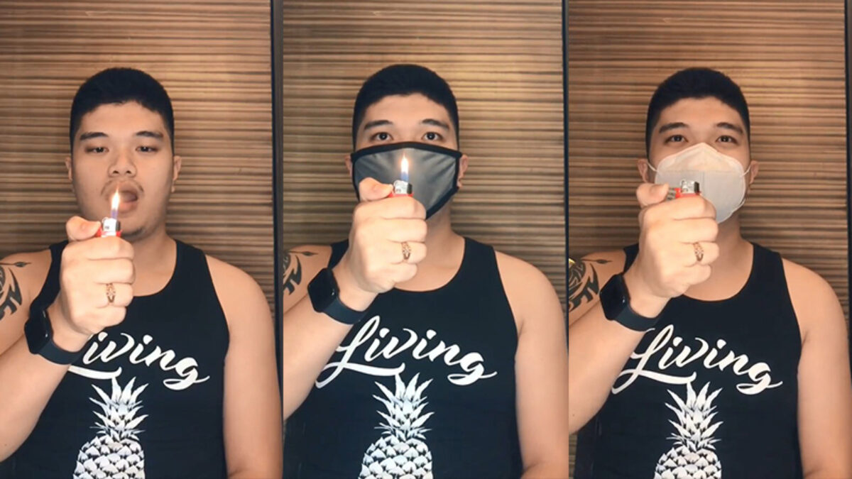 Kerel demonstreert met behulp van een aansteker het verschil in mondkapjes