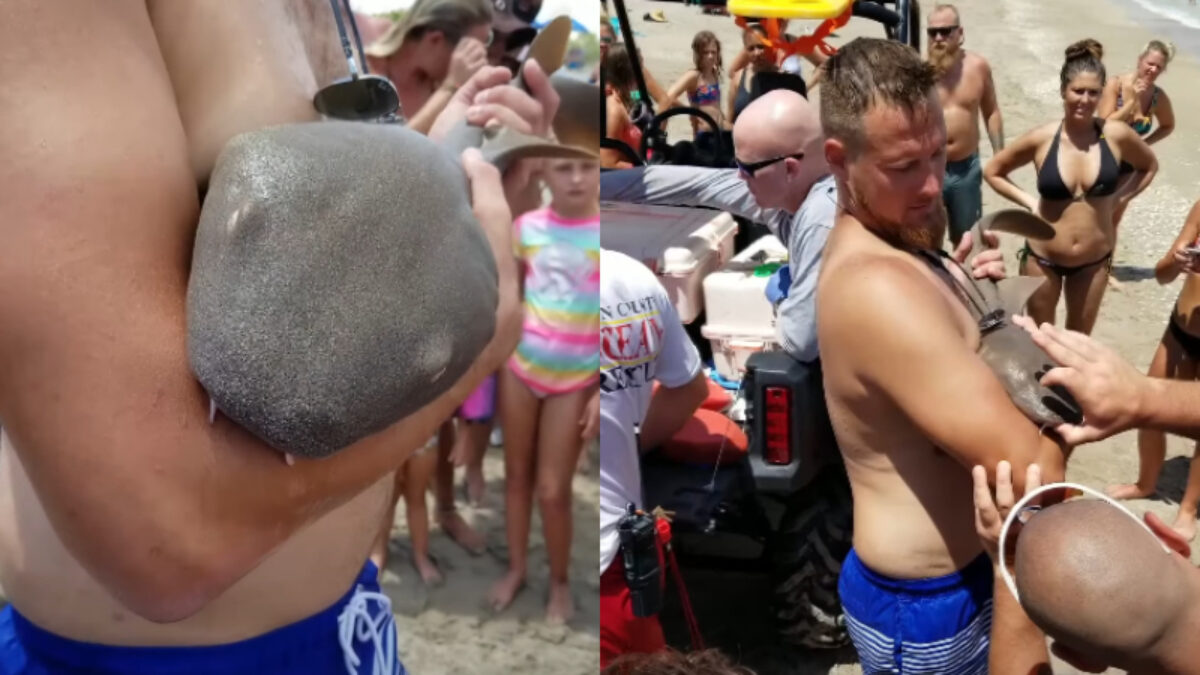 Heb jij weer. Ga je voor het eerst met je koter naar het strand, heb je ineens een babyhaai aan je arm hangen. Tijdens het zwemmen werd de man ineens gebeten en het beestje wilde niet meer loslaten. Dankzij hulp zijn de haai en de man later alsnog van elkaar gescheiden.
