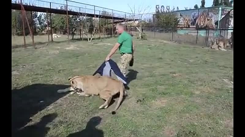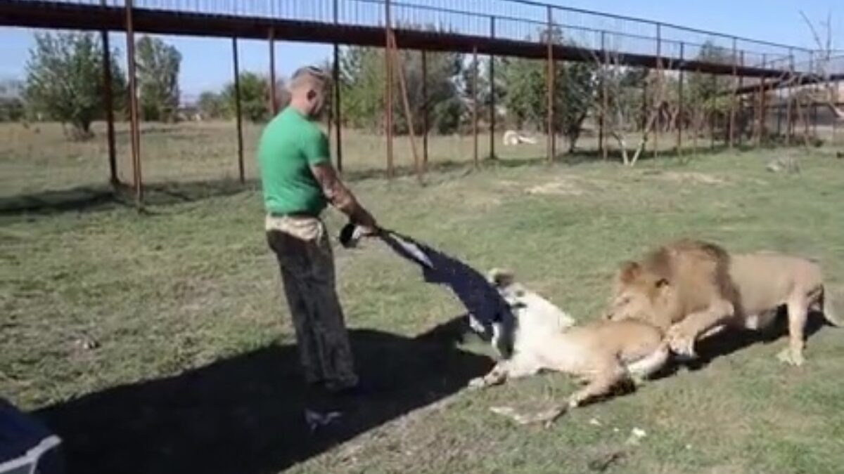 Mannetjesleeuw komt de dierenverzorger even helpen met zijn trui