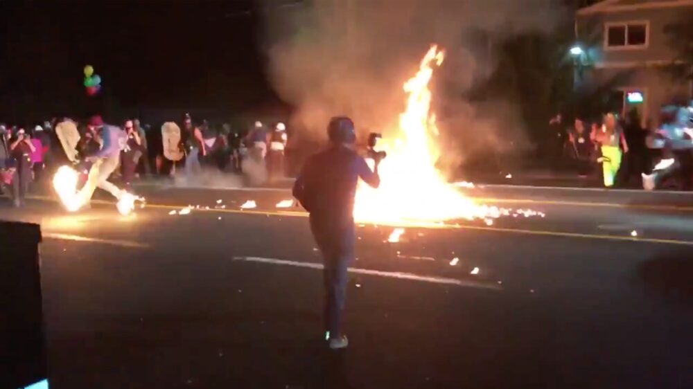 Aangezien Ted Wheeler, de burgemeester van Portland, vorige week vorige week de aanval op Donald Trump opende, is er nog steeds niet (fatsoenlijk) ingegrepen in het altijd gezellig Portland. Ook vandaag vlogen de molotovcocktails vrolijk door de lucht, maar helaas voor deze relschopper zette hij ook zichzelf gedeeltelijk in de hens.