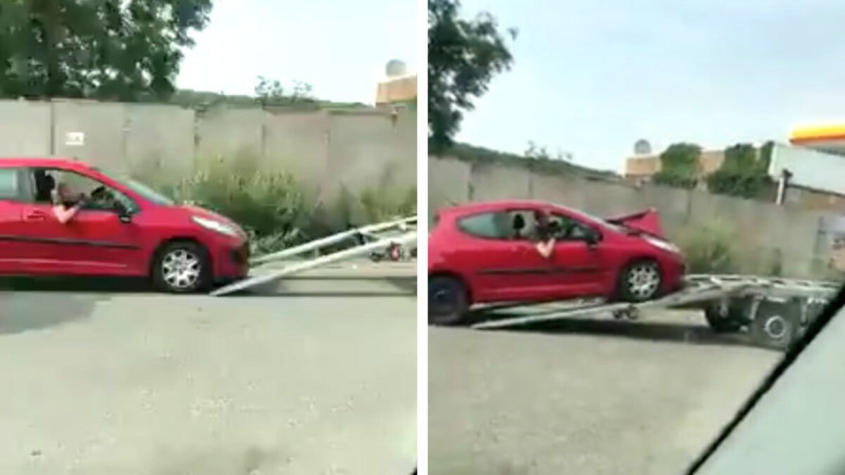 "Oh, je hebt geen sleepoog? Geen probleem, ik hang hem wel achter je motorkap".