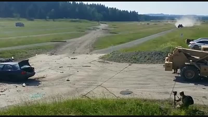 Tank vlamt op volle snelheid dwars door een auto heen Verkeer