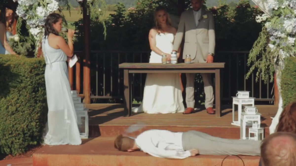 Als het bruidsmeisje meent de oren van alle aanwezigen te moeten pijnigen moet je als getuige actie ondernemen. Deze held redde de dag, al kwakt ie wel verdomde hard tegen de grond.