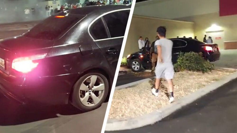 Uitslover in BMW knalt op vluchtheuvel als hij een burnout maakt