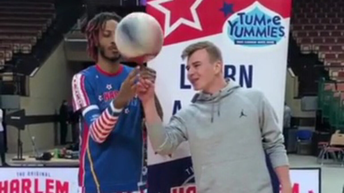 Harlem Globetrotter probeert een fan een trucje te leren Fun