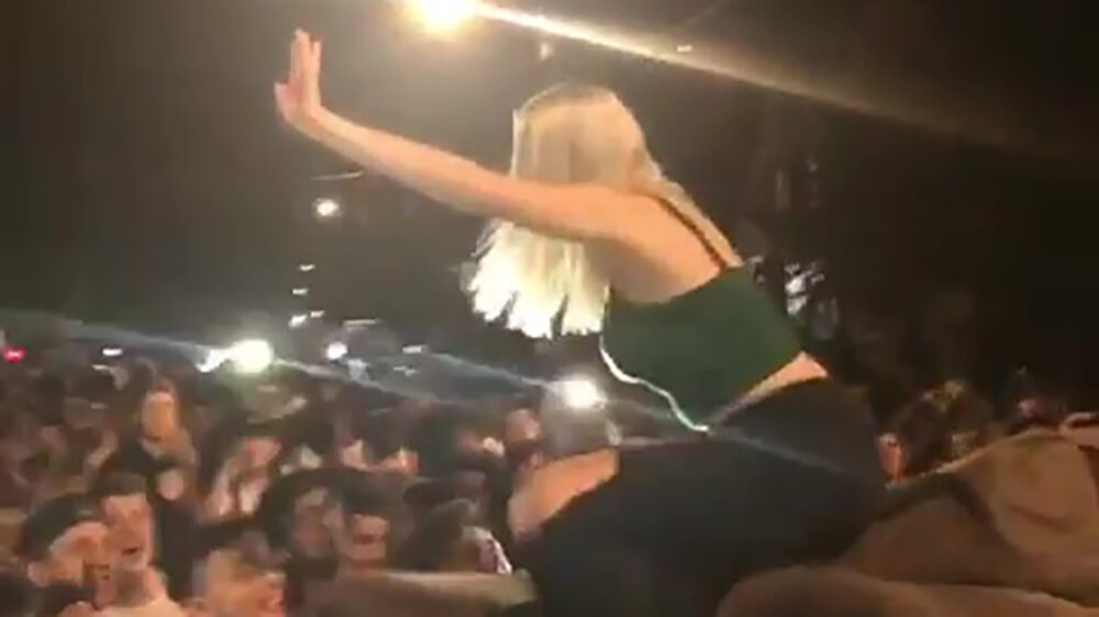 Blondie gaat lekker crowsurfen op een bank