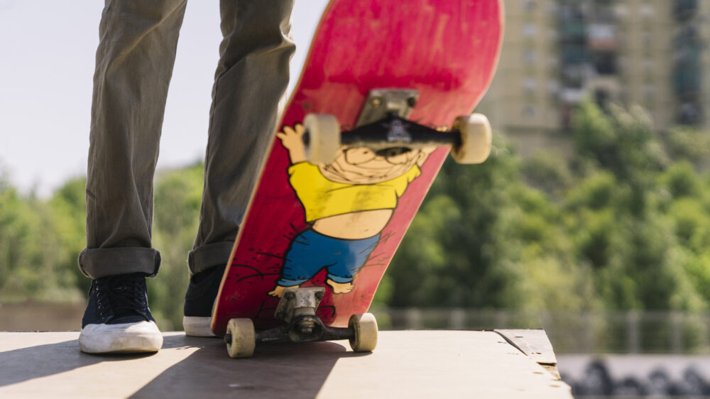 Kerel enthousiast om nieuwe skateboardtruc aan vriendin te laten zien